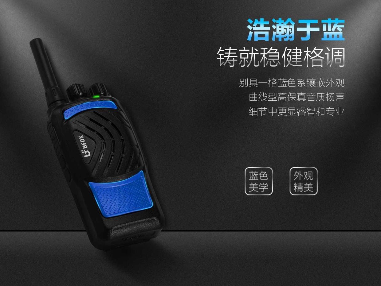 BF-CM389公网对讲机打破单一的色调,经典的黑色机身镶嵌沉稳的蓝色系,彰显睿智和专业。曲线型高保真音质扬声器面盖融入全面升级的机身材质,铸就质感十足的稳健魅力。