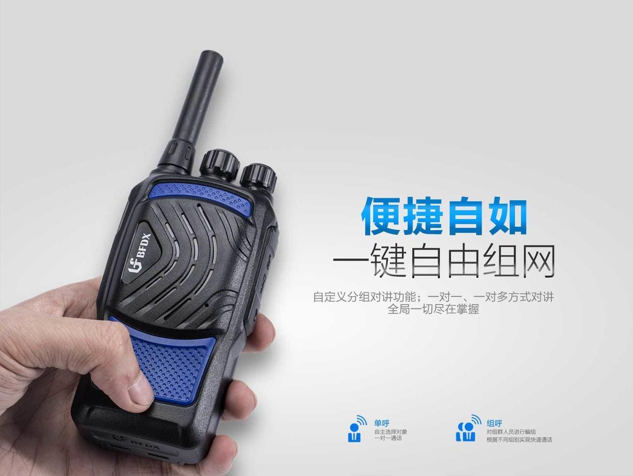 BF-CM389公网对讲机从操作上真正实现便捷设计;独立的单呼与组呼、采用按键切换的形式,一键就能轻松切换;当对讲转入群组模式下,利用机身上方的旋转按钮进行操作,完美贴合人体工学的齿轮造型,白色刻度标尺也更具有识别性,做到不同群组间的自由选择。